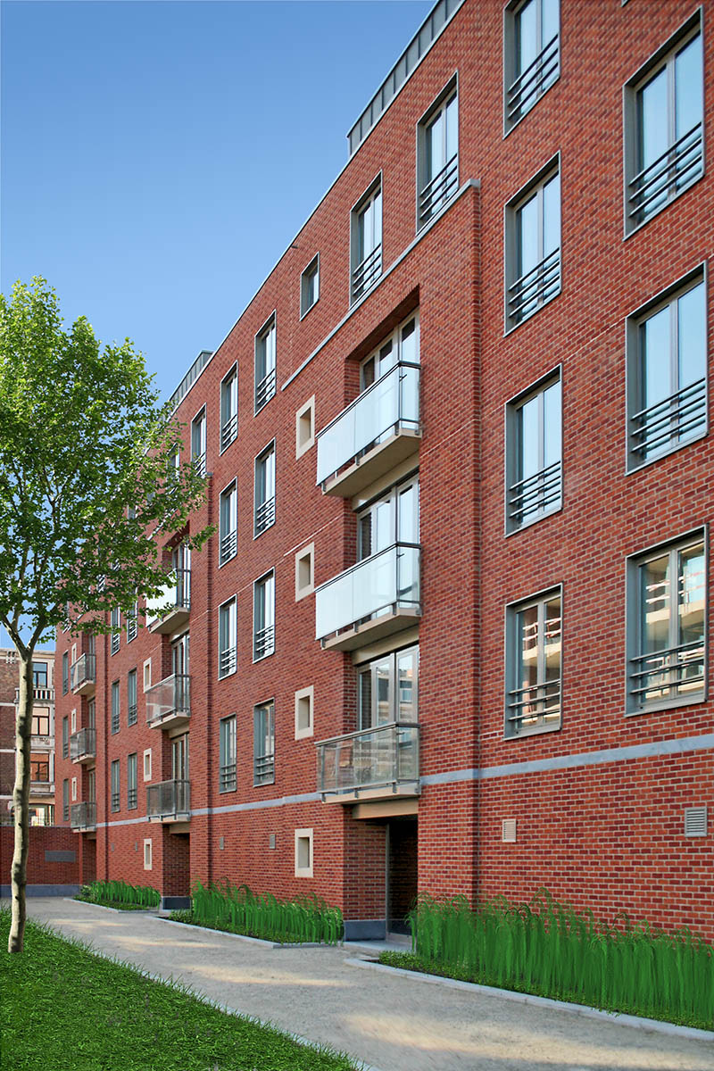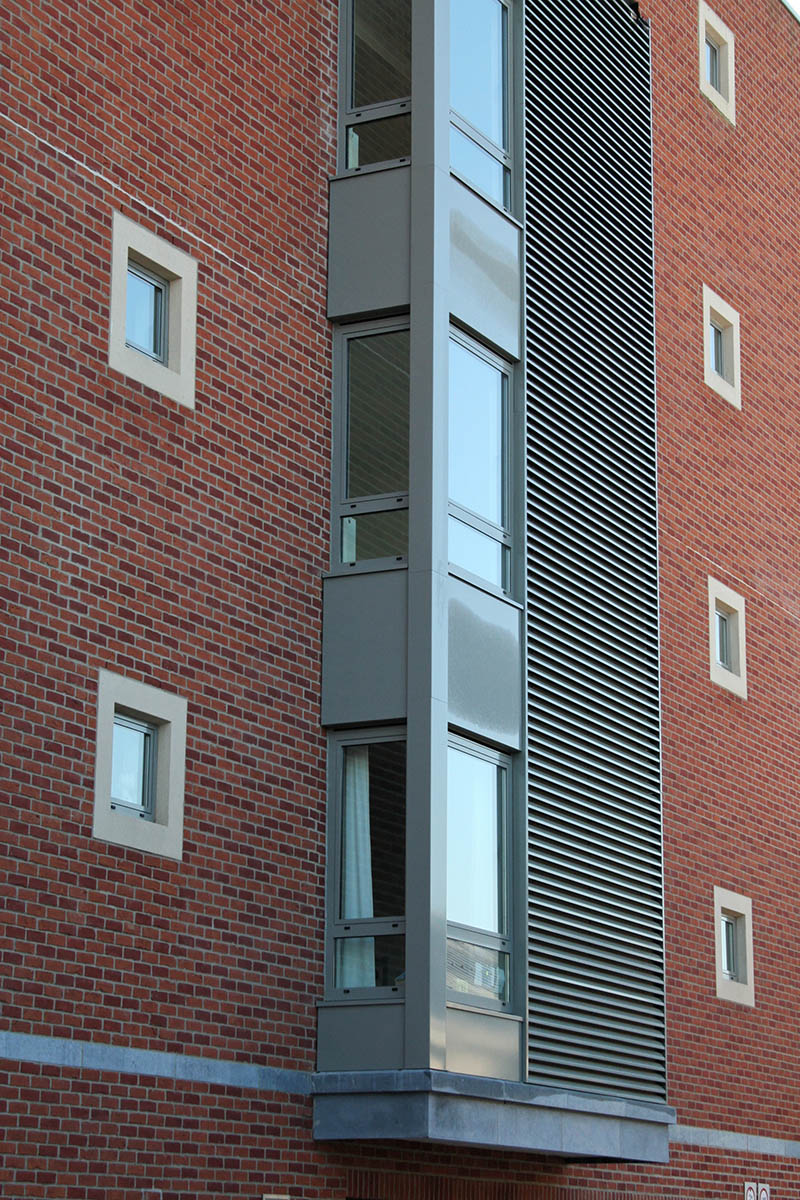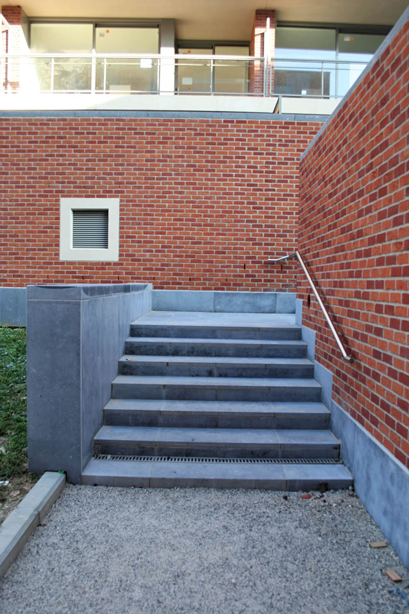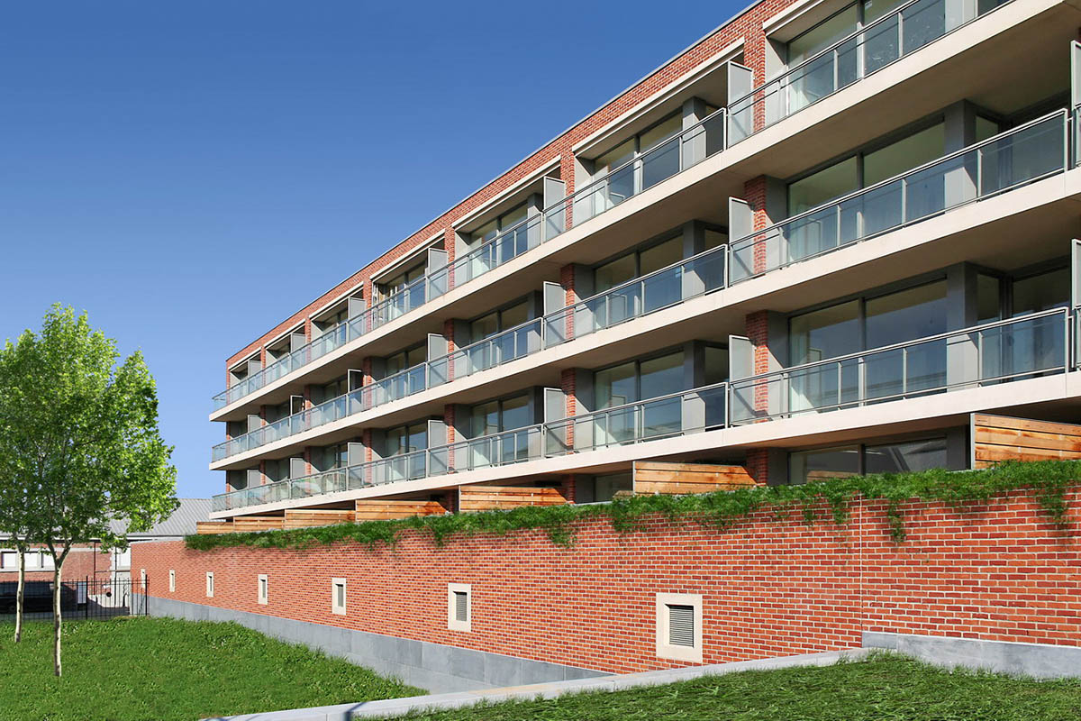 Une vision urbanistique respectueuse du patrimoine a été développée en collaboration avec le bureau d’architecture associé ARCHI 2000. Les bâtiments s’inscrivent dans une architecture sobre, fonctionnelle et respectueuse de la typologie pavillonnaire caractéristique du site. L’identité des lieux est renforcée par l’utilisation d’un langage commun : la pierre naturelle pour les soubassements, la brique de terre cuite pour les parements, le métal pour les chassis et les garde-corps.