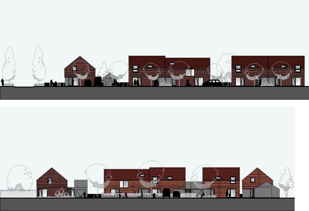 L'expression architecturale se veut sobre, efficace et durable, au service du caractère rural apaisant qui caractérise ce lieu. Pour atteindre ce résultat, nous avons choisi de limiter les matériaux de construction, nous avons privilégié les effets de contraste de matière et de couleur ainsi que les jeux de pleins et de vides. Ce langage assure une certaine unité dans le projet tout en permettant à chacun d'individualiser son habitation.