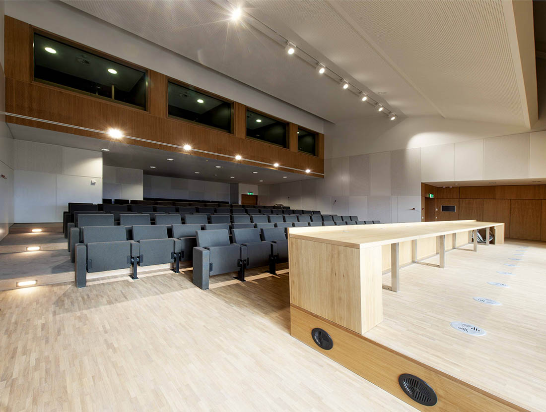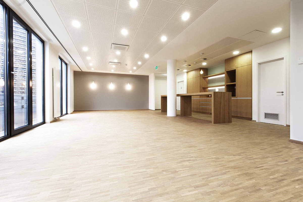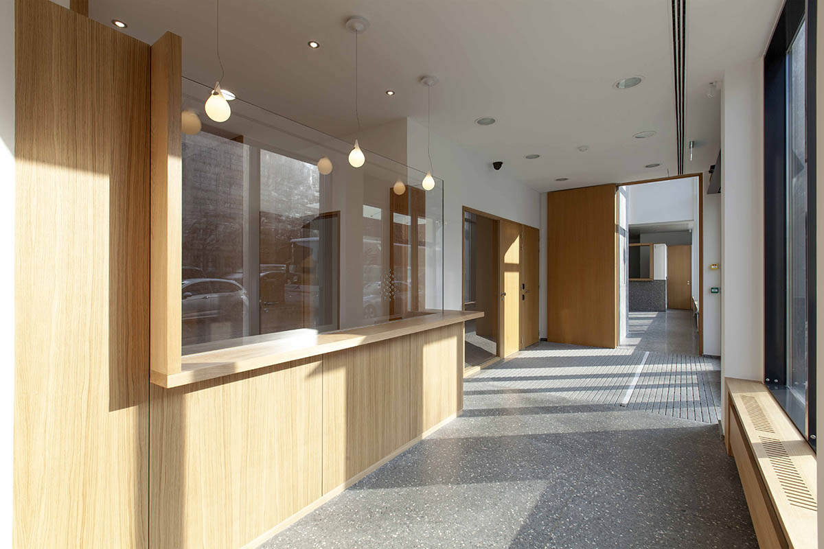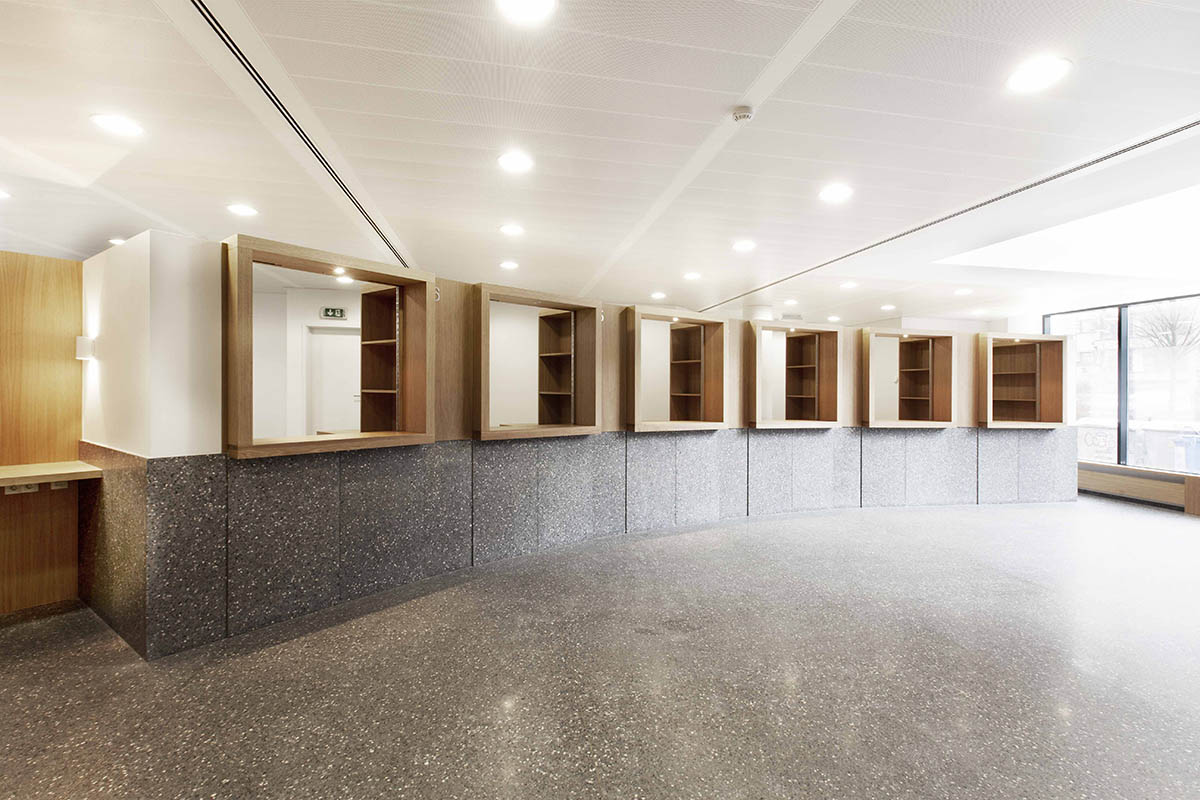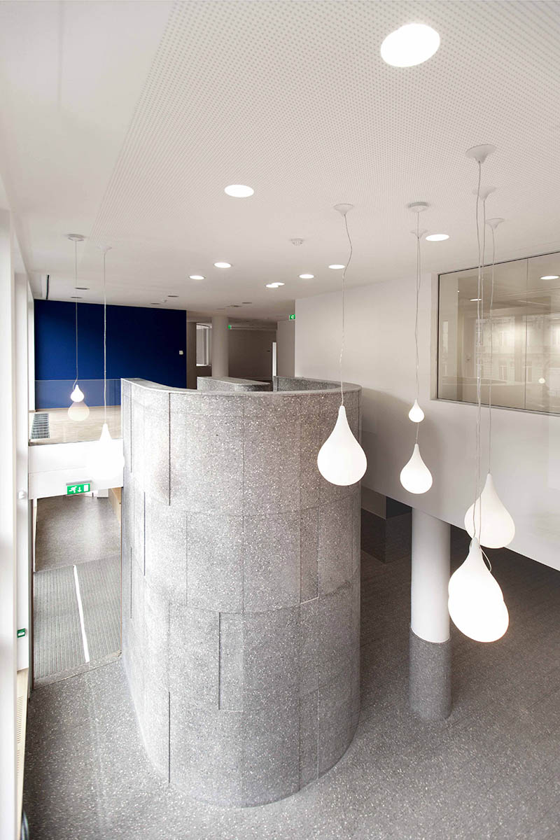 ATLANTE a également conçu l’ensemble du mobilier fixe qui équipe l’immeuble de bureau et notamment un comptoir d’accueil, une salle des guichets, un auditorium, un bar…