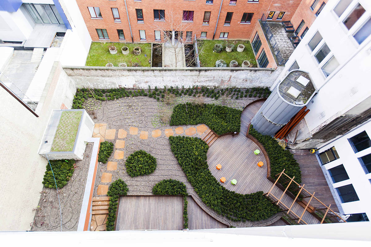 La construction de cet ensemble inclut des parkings souterrains sur deux niveaux de sous-sol et un jardin paysager en intérieur d’îlot.