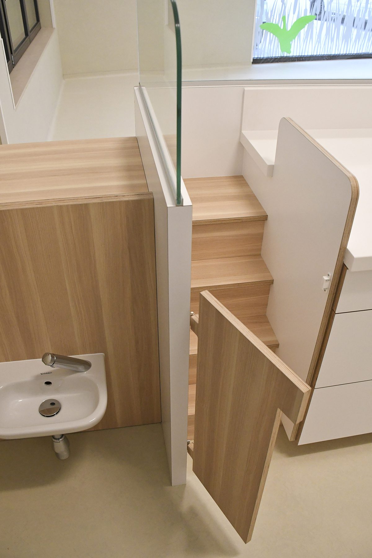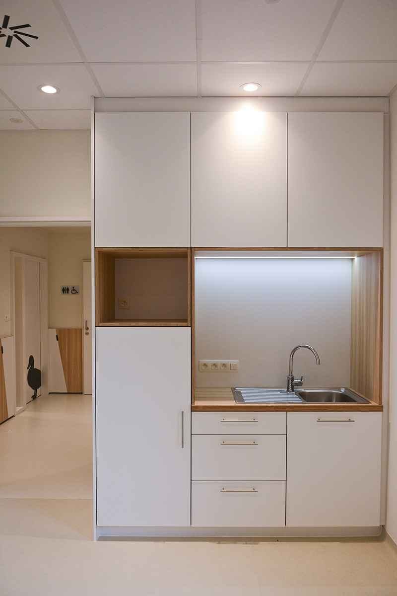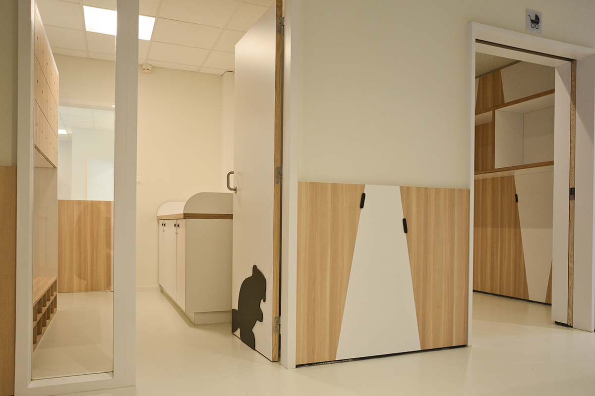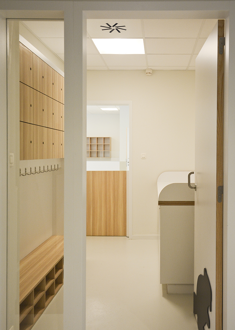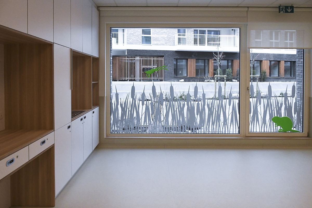 Les 4 sections de la crèche s'organisent autour d'un foyer d'accueil. Avec le souci du détail, les aménagements y sont conçus au service de l'épanouissement de l'enfant et de l'apprentissage de l'autonomie. Les espaces techniques, réservés au personnel, sont implantés en sous-sol. La thématique des roseaux est le fil conducteur du concept d'aménagement. C'est l'attache au caractère marécageux du site et à la noue paysagère inscrite au centre de ce projet urbain qui ont dicté ce choix. Chacune des sections s'identifie par un animal de marécage (libellule, grenouille, canard, castor). Les roseaux, présents sur les 2 vitrines donnant le square, assurent à la fois un rôle identitaire et de protection. A l’arrière, dans la continuité du thème, un jardin de jeux accueille les enfants : poteaux bois, banquettes, cabane, potagers... .