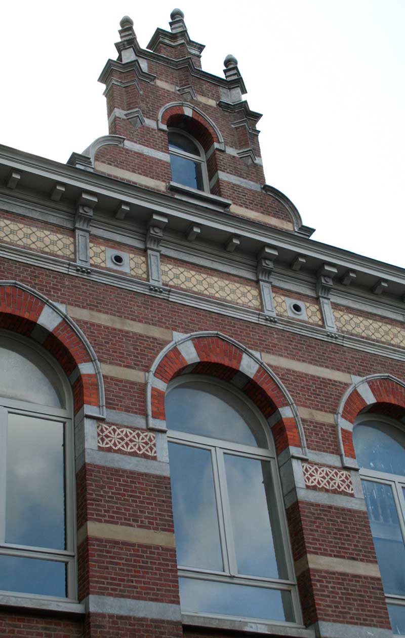 Les façades de ces bâtiments se caractérisent par l’utilisation de matériaux traditionnels : la brique canal, une brique rouge-orangée pour les plates bandes, des carreaux de faïence en décoration. La pierre bleue taillée est utilisée pour les soubassements, les chaînages, les seuils de fenêtre, les jambages, les rampants de pignon, et pour certains éléments décoratifs.