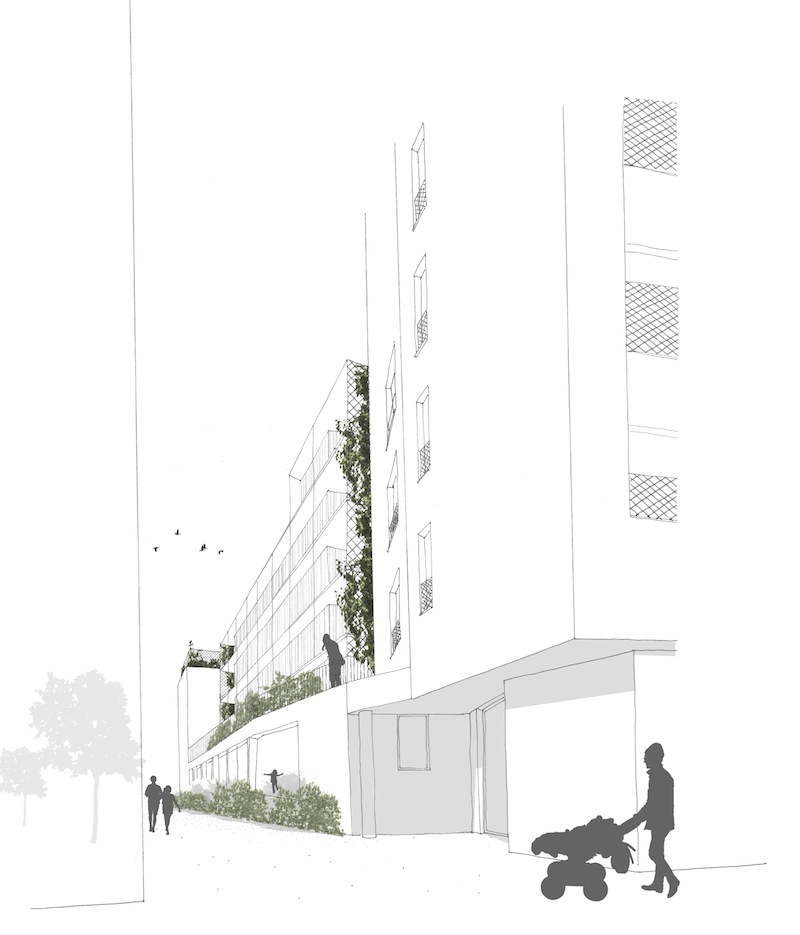 Un volume plus modeste, à l'échelle des habitations voisines, est implanté à l'angle de la rue BoneHill. Ces deux articulations sont reliées entre elles par un socle qui intègre les accès, les locaux communs, la crèche et le parking. Sur ce socle est déposé un volume en construction bois. Les deux bâtiments d'angles sont dissociés de la construction bois via des failles qui accueillent les circulations verticales et permettent des pénétrantes de lumière.