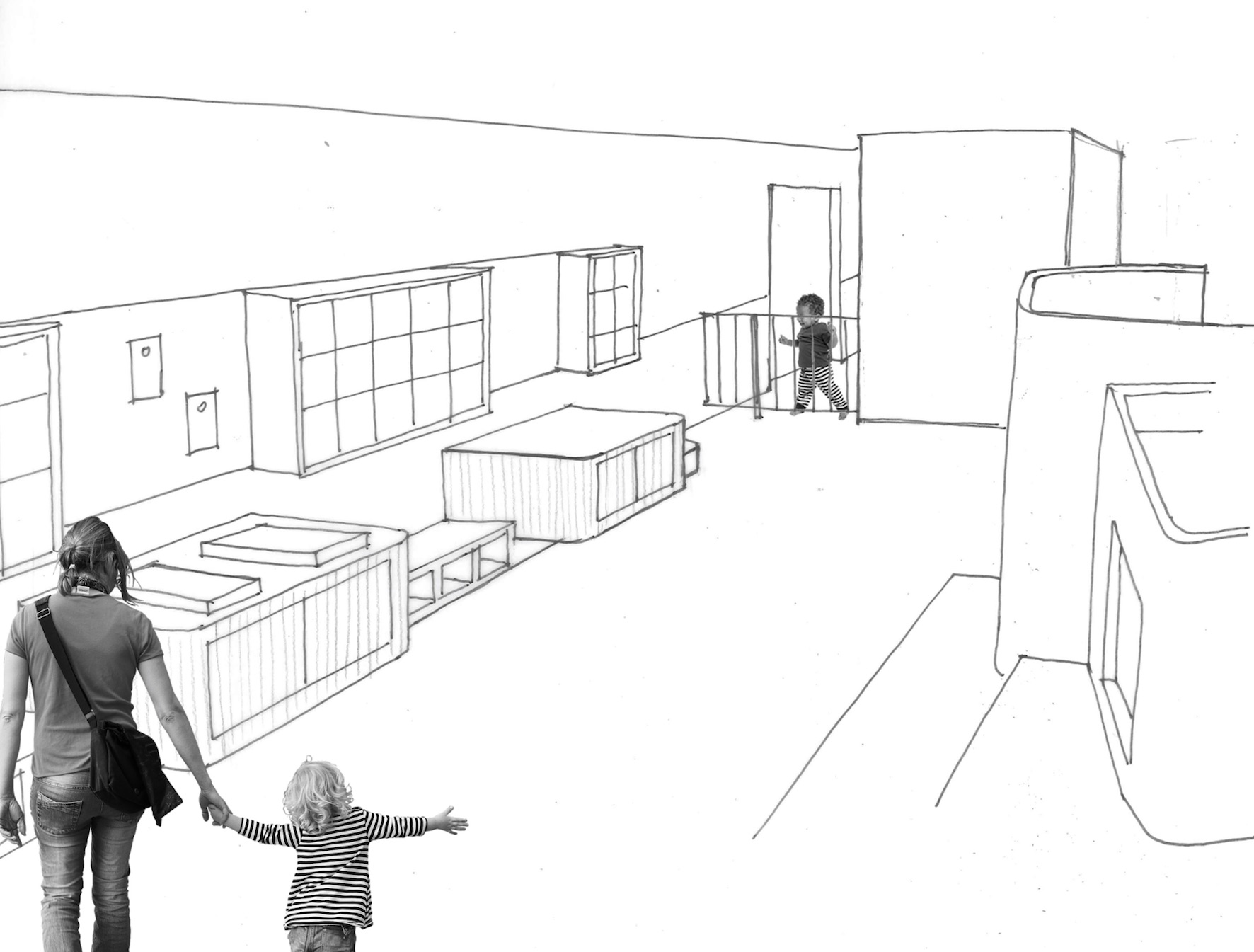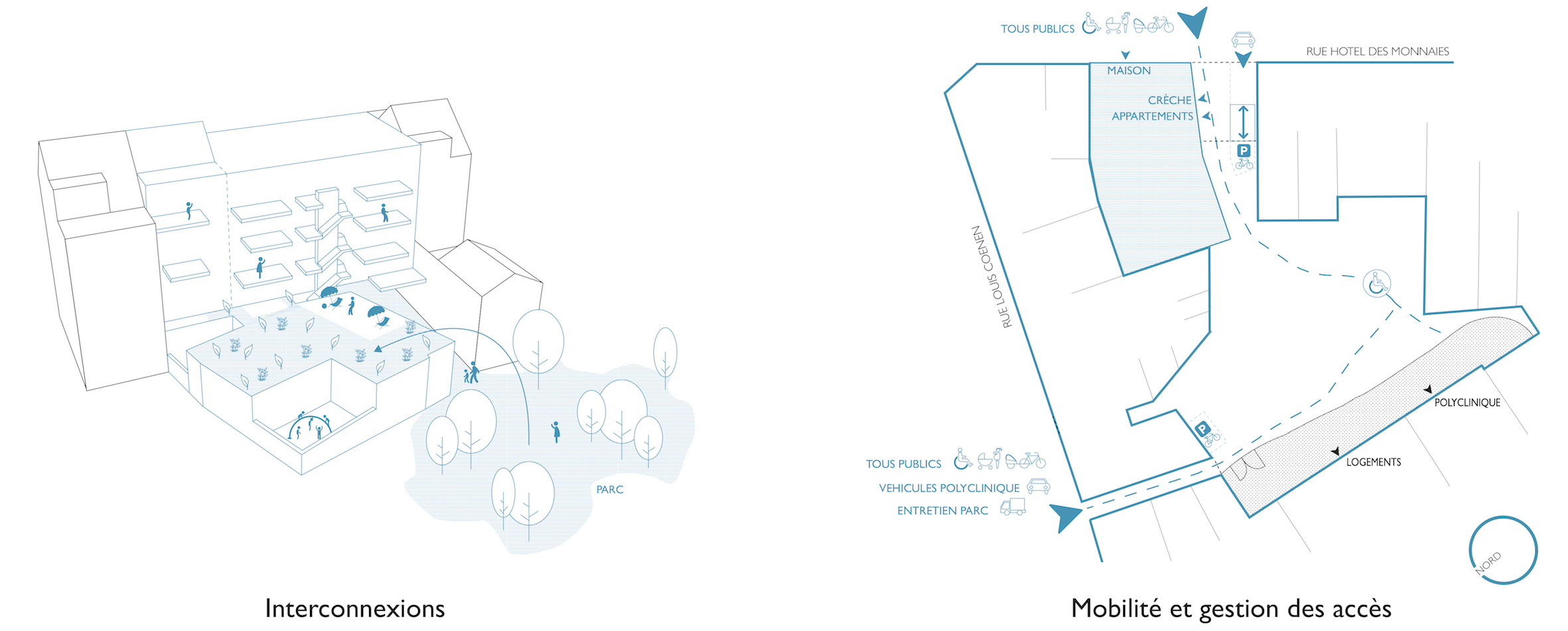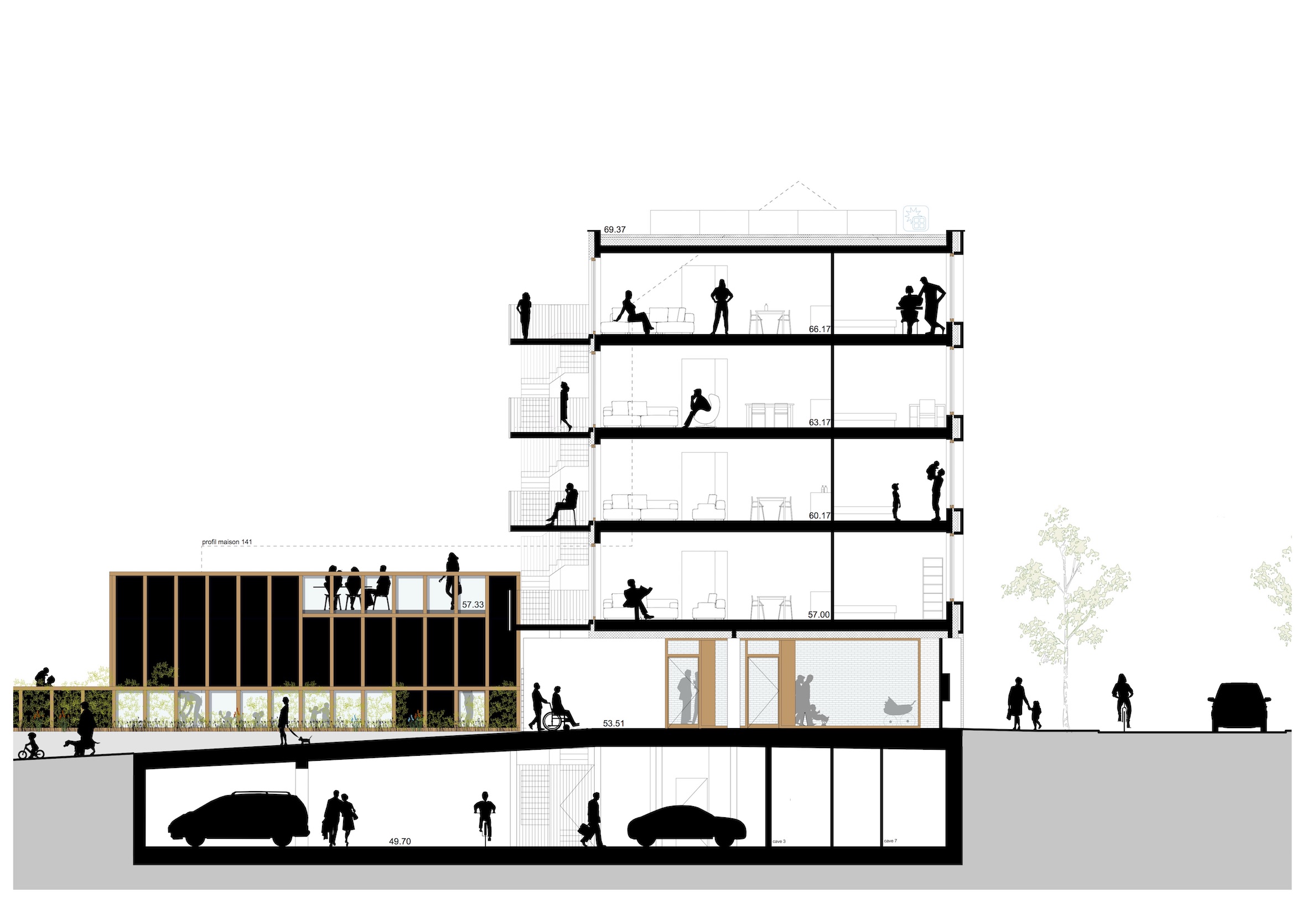 La crèche occupe le rez de chaussée à rue et assure le contrôle social à l'entrée du porche qui mène au parc. La fonction est pleinement identifiable depuis l'espace public.