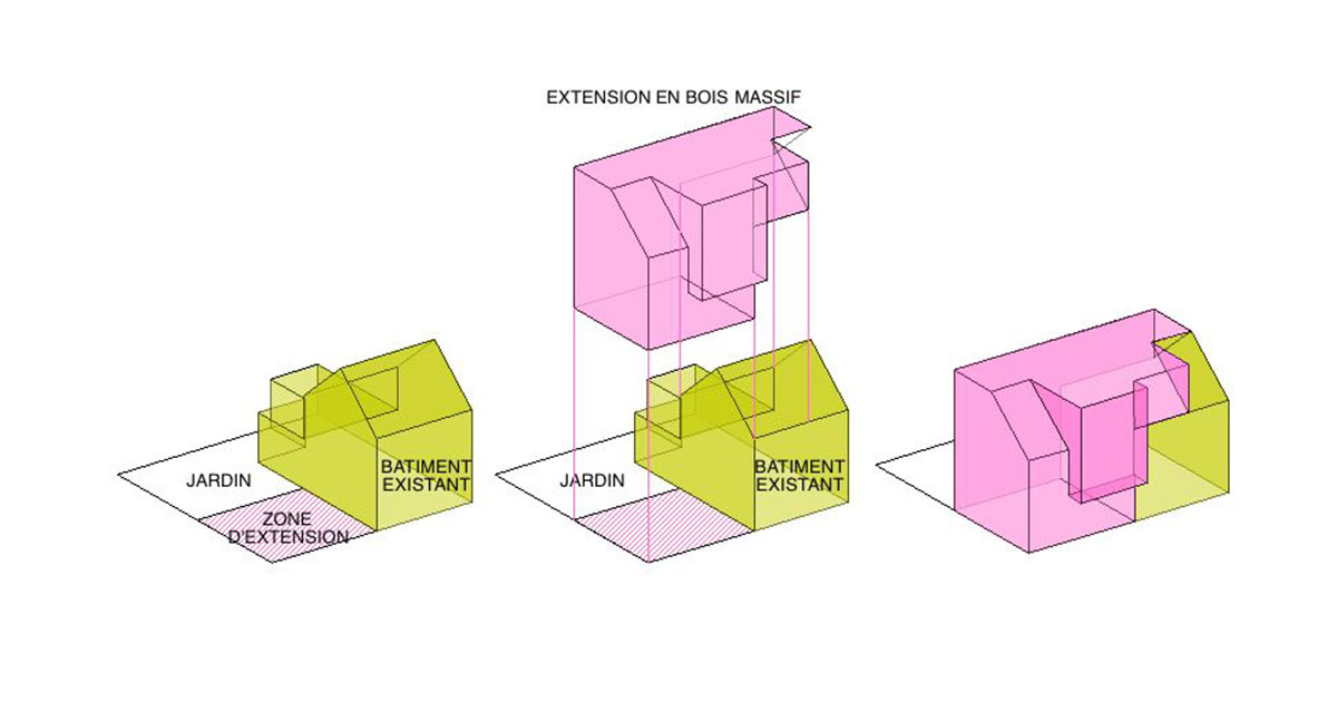 En plus de la réorganisation du bâtiment existant, une nouvelle extension en bois massif a été imaginée pour recréer un front de rue continu de gabarit similaire et augmenter les espaces habitables du 2ème étage.