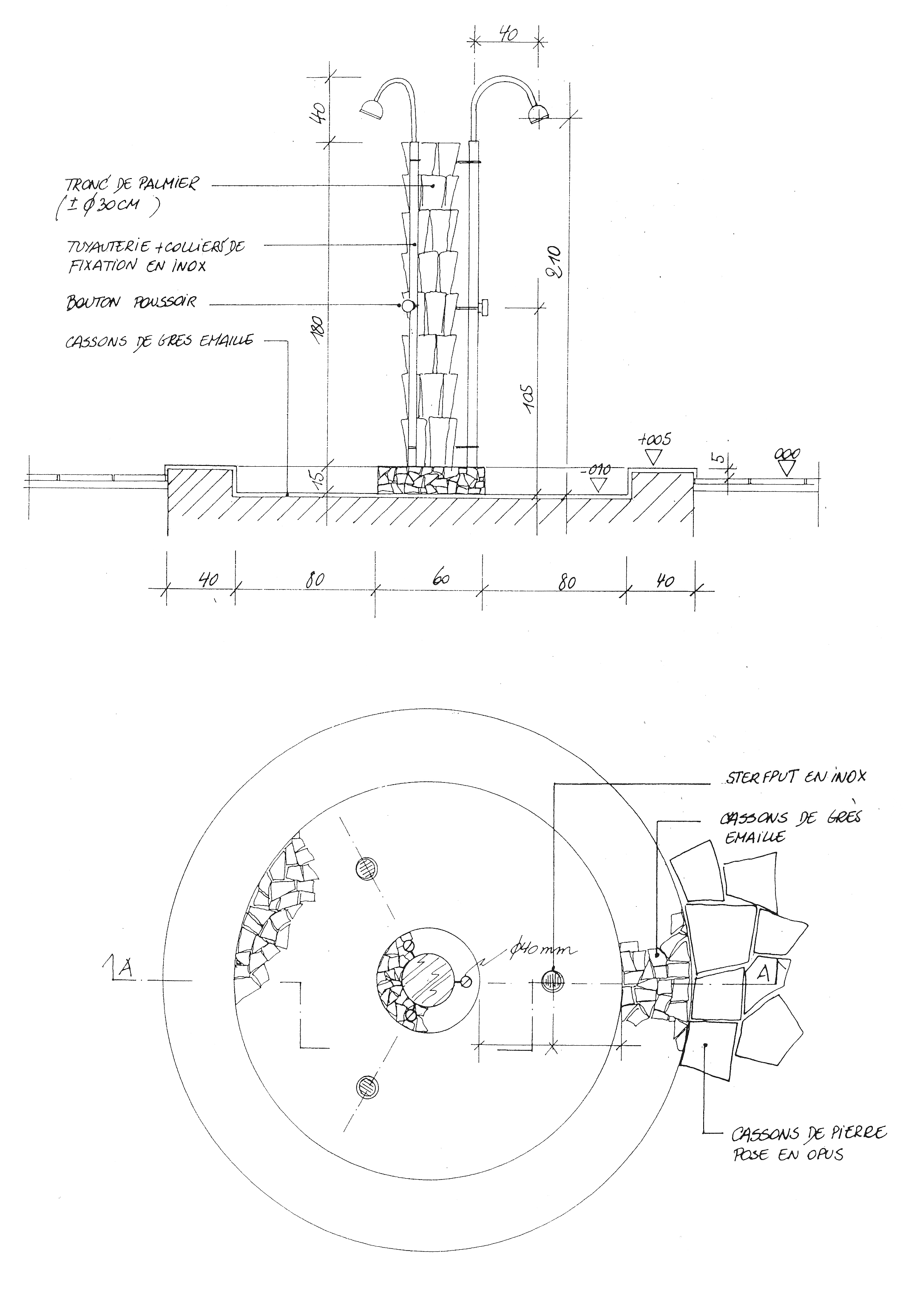 Pour la conception de la tente, ATLANTE s’est particulièrement attaché aux aspects de confort d’aspect et de la qualité technique des matériaux textiles pour créer les enveloppes protectrices de cette grande tente qui couvre au sol quelques 83 m2 pour seulement une vingtaine de m2 utiles, le solde permet généreusement à l’air chaud de s’échapper par convection naturelle. La toile de lin écru constitue sa «peau extérieure», l’humidité contracte le lin, le soleil dilate les mailles, son élasticité est réputée. La « peau intérieure » est réalisée en coton pour ses qualités de fraîcheur et de facilité d’entretien. Une « cabine sanitaire » a été conçue aux dimensions « bateau » le juste nécessaire. Un grand auvent marque l’entrée de la tente, il crée une zone d’ombre et de fraîcheur sur le sable, particulièrement appréciée sous les latitudes sahariennes.