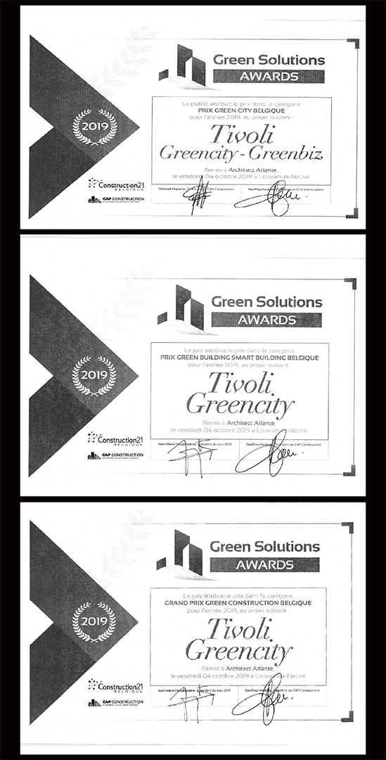 En 2019, le concours international organisé par le réseau Construction21, les Green Solutions Awards mettent en avant des bâtiments, des quartiers et des infrastructures exemplaires contribuant à la lutte contre le changement climatique. Tivoli Green City s’est vu séléctionnés par le jury pour non pas une, ni deux mais TROIS catégories différentes. Le Grand Prix Green Construction Belgique, le Prix Green Building Smart Building Belgique et le Prix Green City Belgique ont été attribués à Adriana.