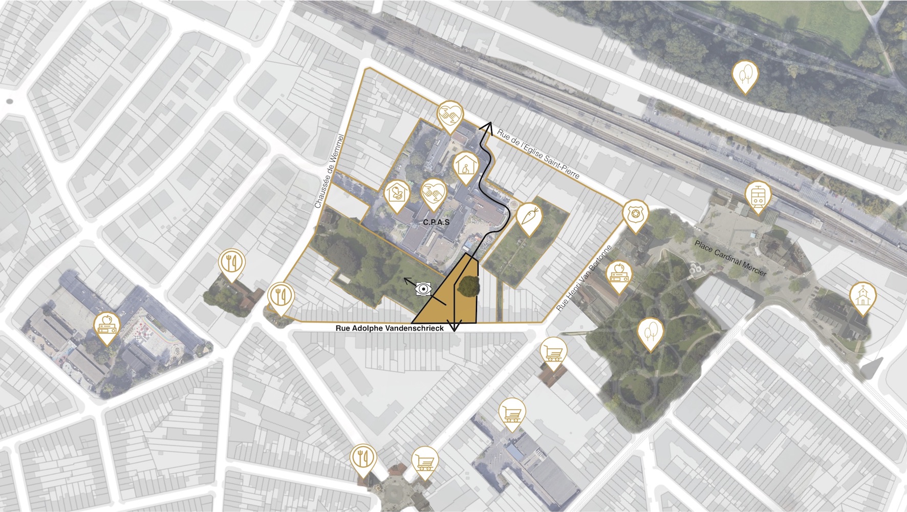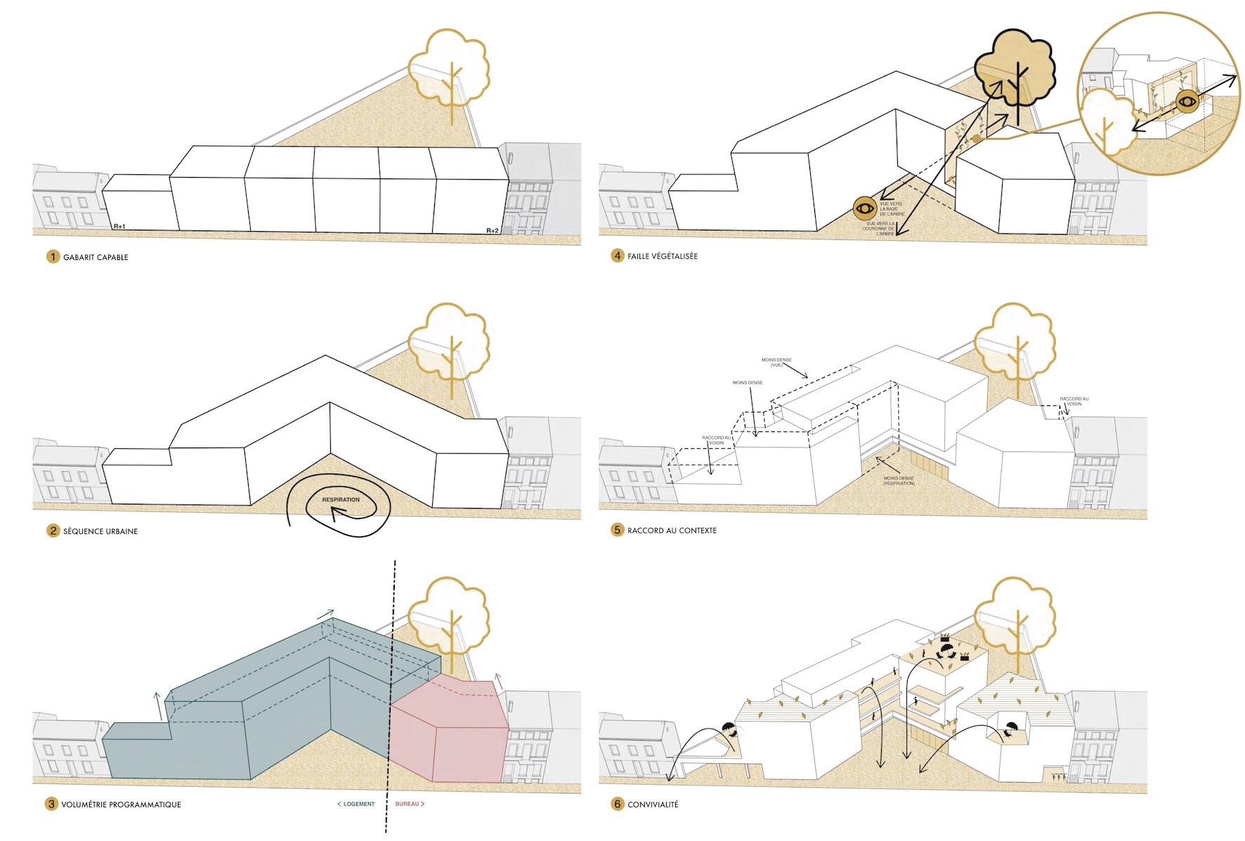 Notre projet architectural et paysager s’inscrit dans le respect des lignes de force structurantes du site et viennent les renforcer. Bâtiment et végétal dialoguent et se complètent afin d’offrir un cadre de vie de qualité aux différents usagers: riverains, habitants, travailleurs et visiteurs. L’objectif est de libérer le sol au profit de la collectivité et du jardin public. Chacune des affectations (jardin public, logement, équipement communal) développe sa propre identité programmatique. Toutefois la volonté est d’assurer une cohérence architecturale afin de ne pas dénaturer le contexte existant.