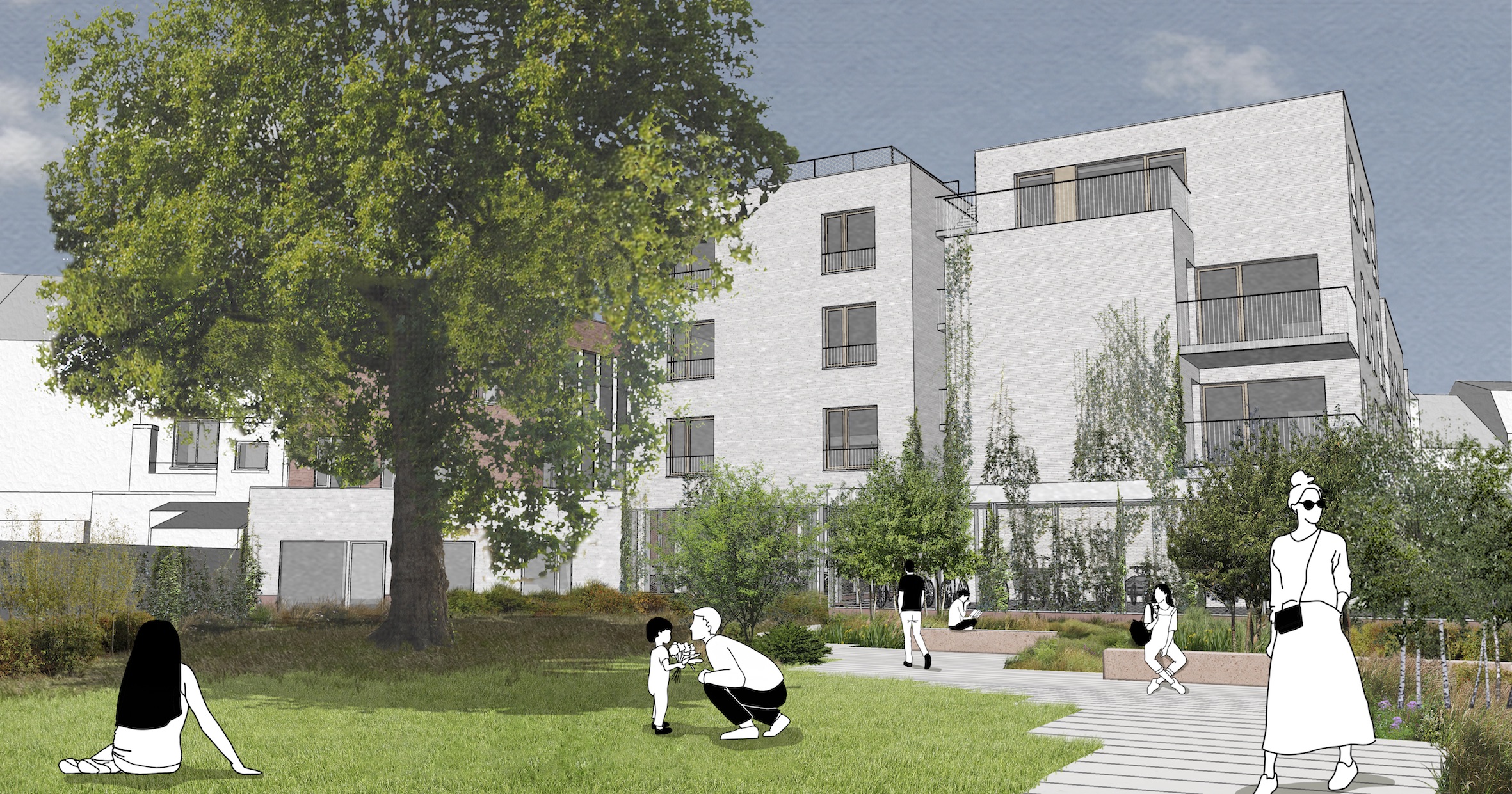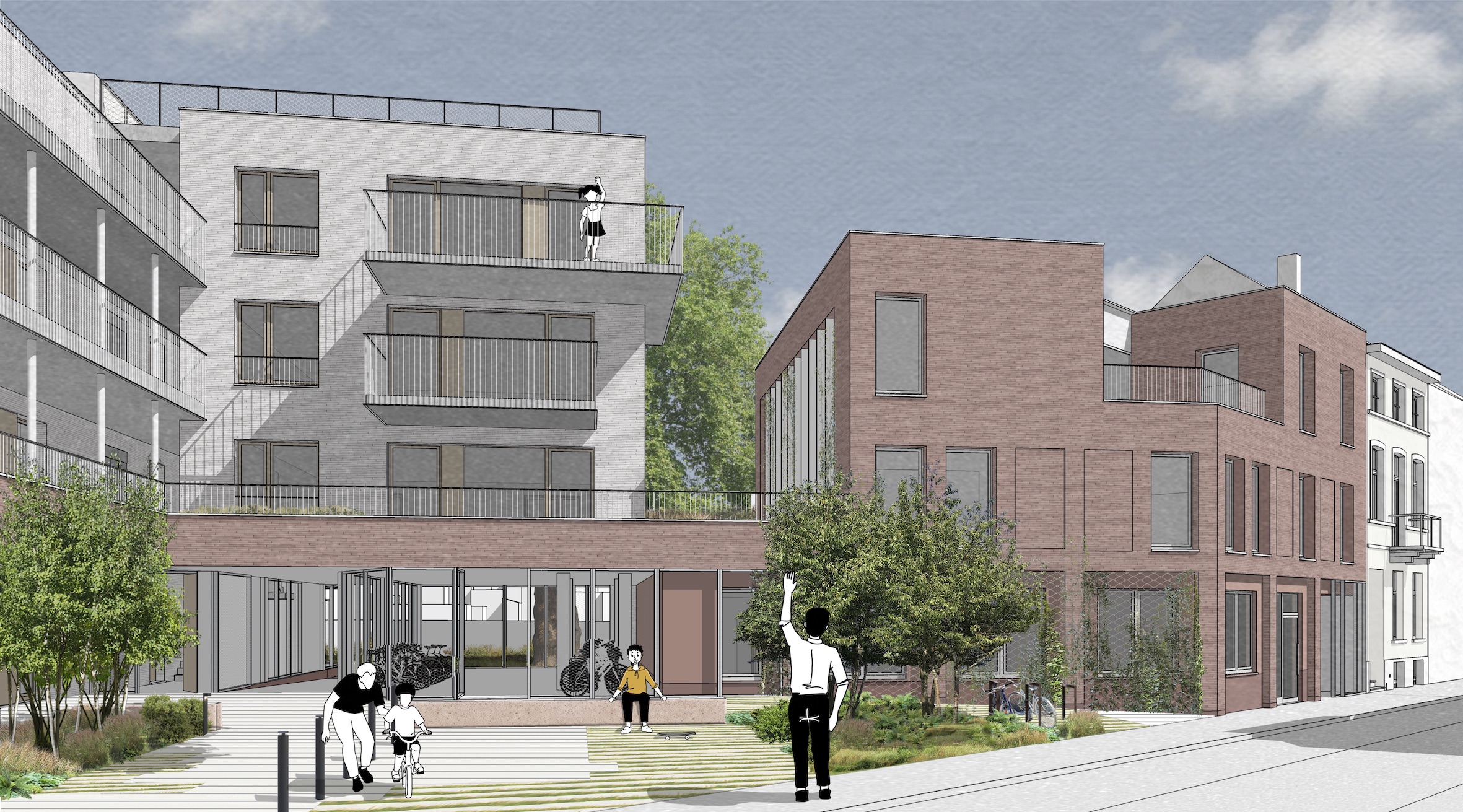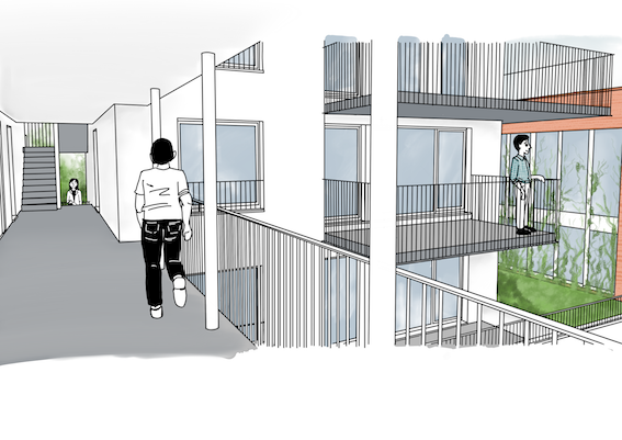 Construction d’un ensemble de 14 logements, d’un équipement public abritant plusieurs services communaux, d’un garage à vélos pour les habitants du quartier et d’un jardin public