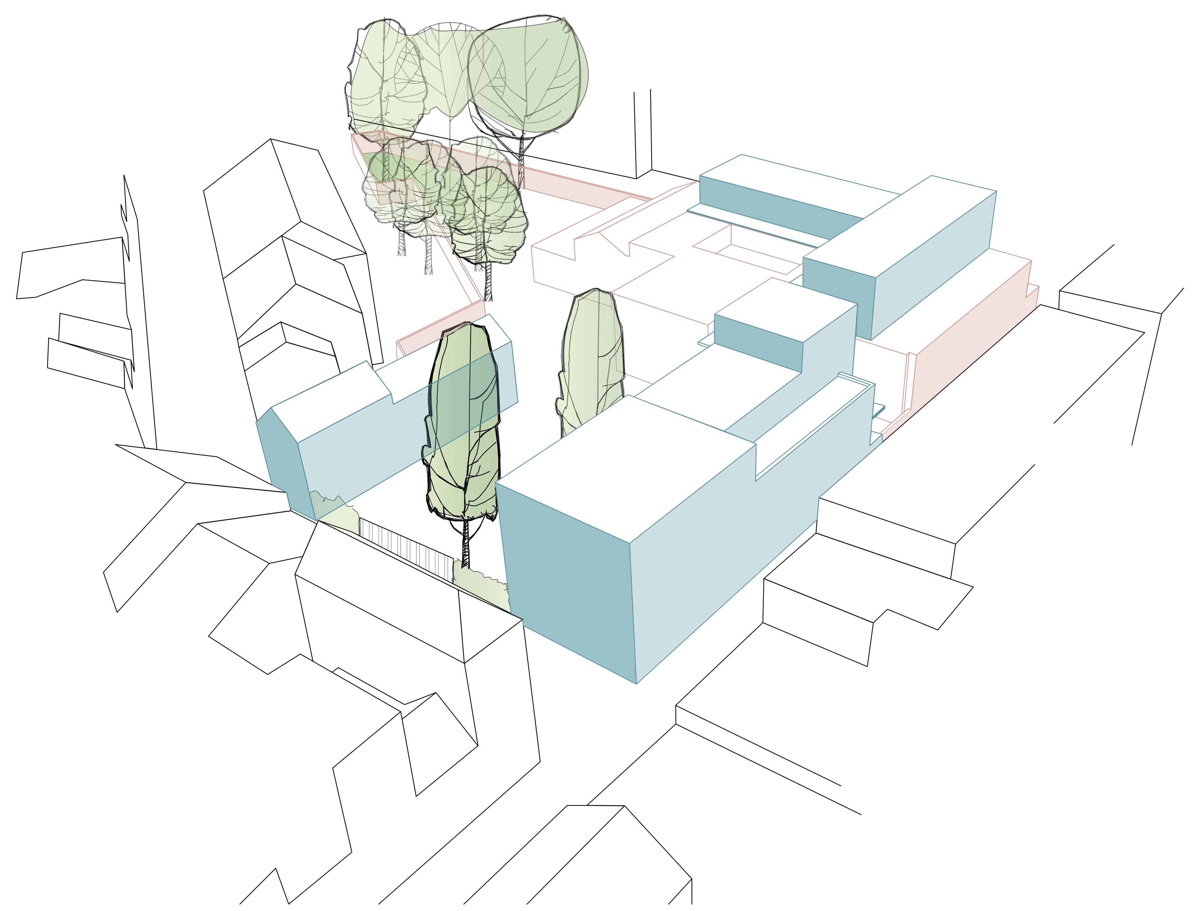 • la visibilité vers l'intérieur d'îlot et l'entrée post moderniste est préservée