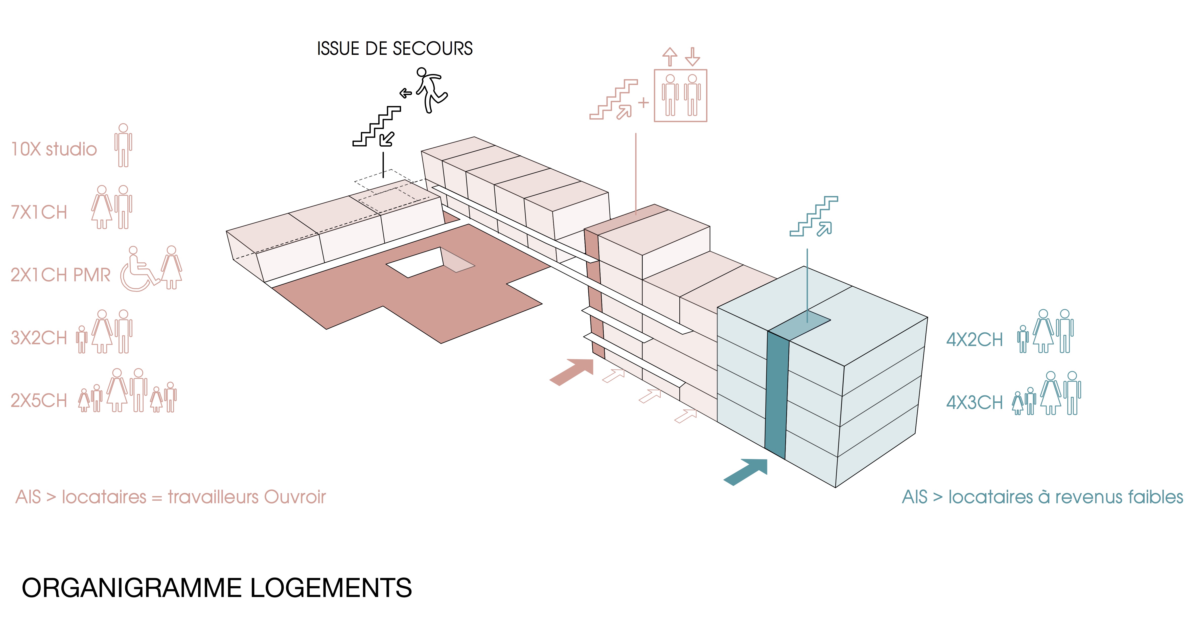 La mixité du projet trouve tout son sens dans l'objet social des 2 partenaires. L'objectif recherché est de créer une synergie entre les 2 affectations, d'apporter une plus value au quartier en offrant un complément de logements à loyers abordables.